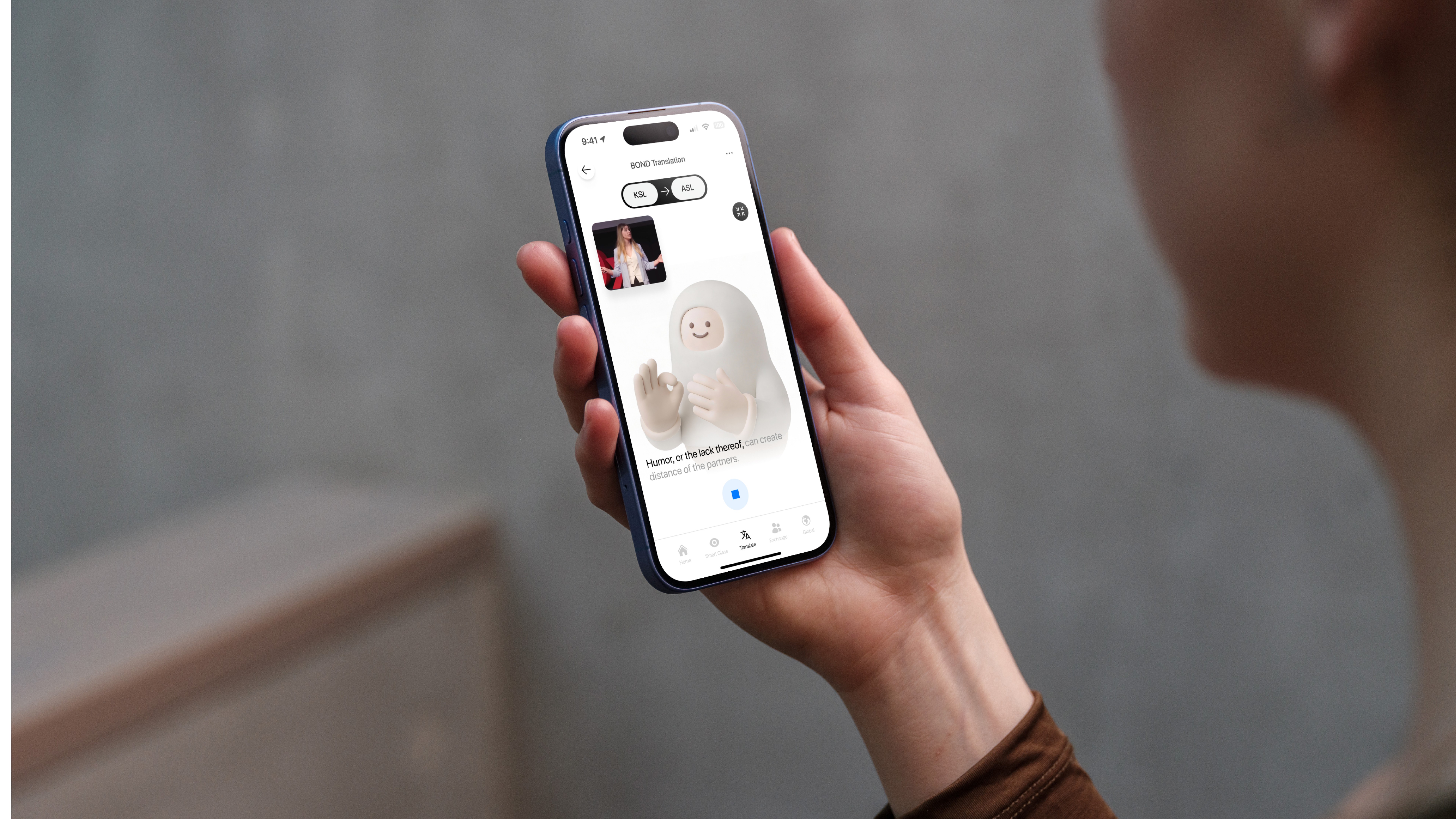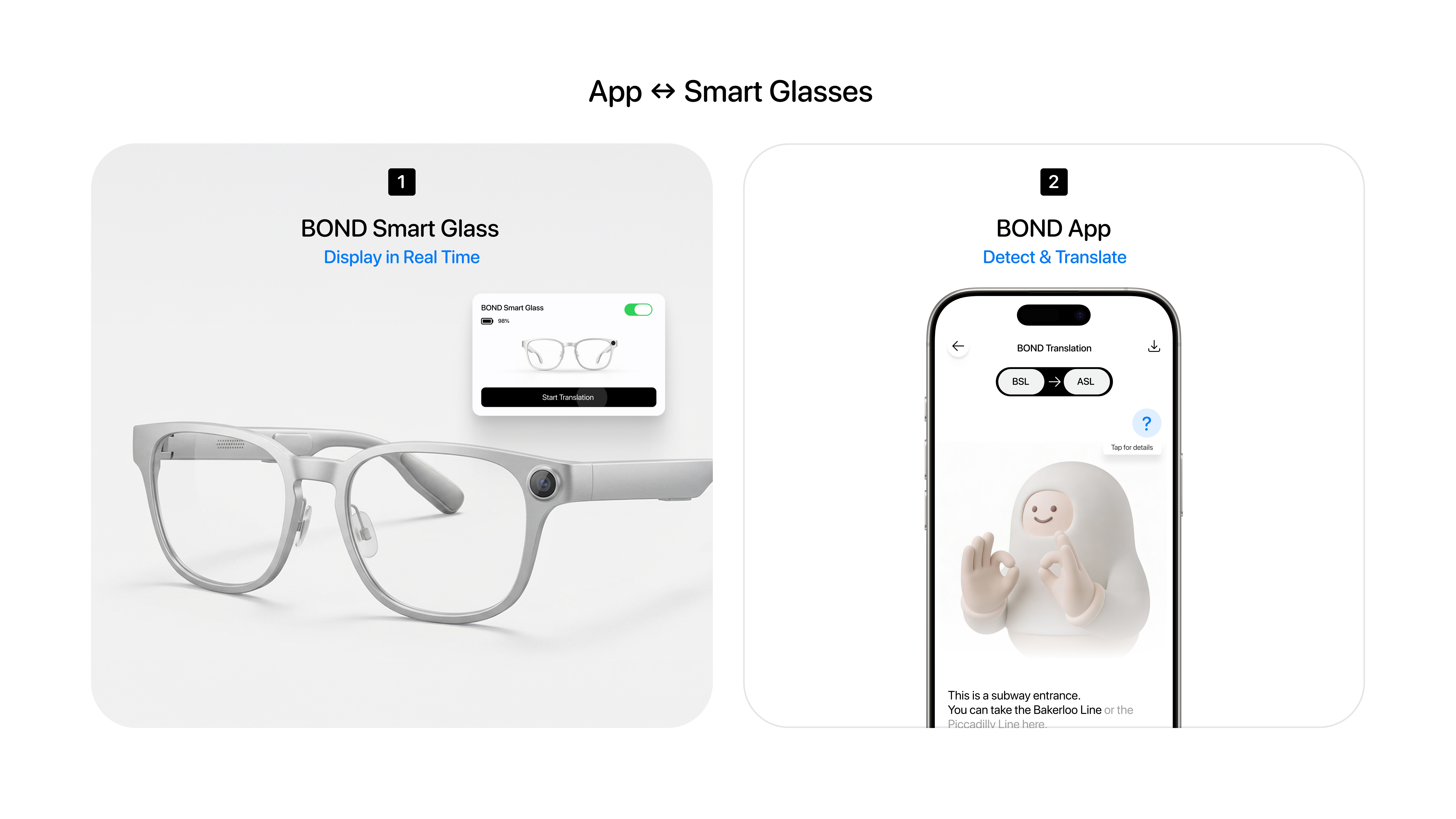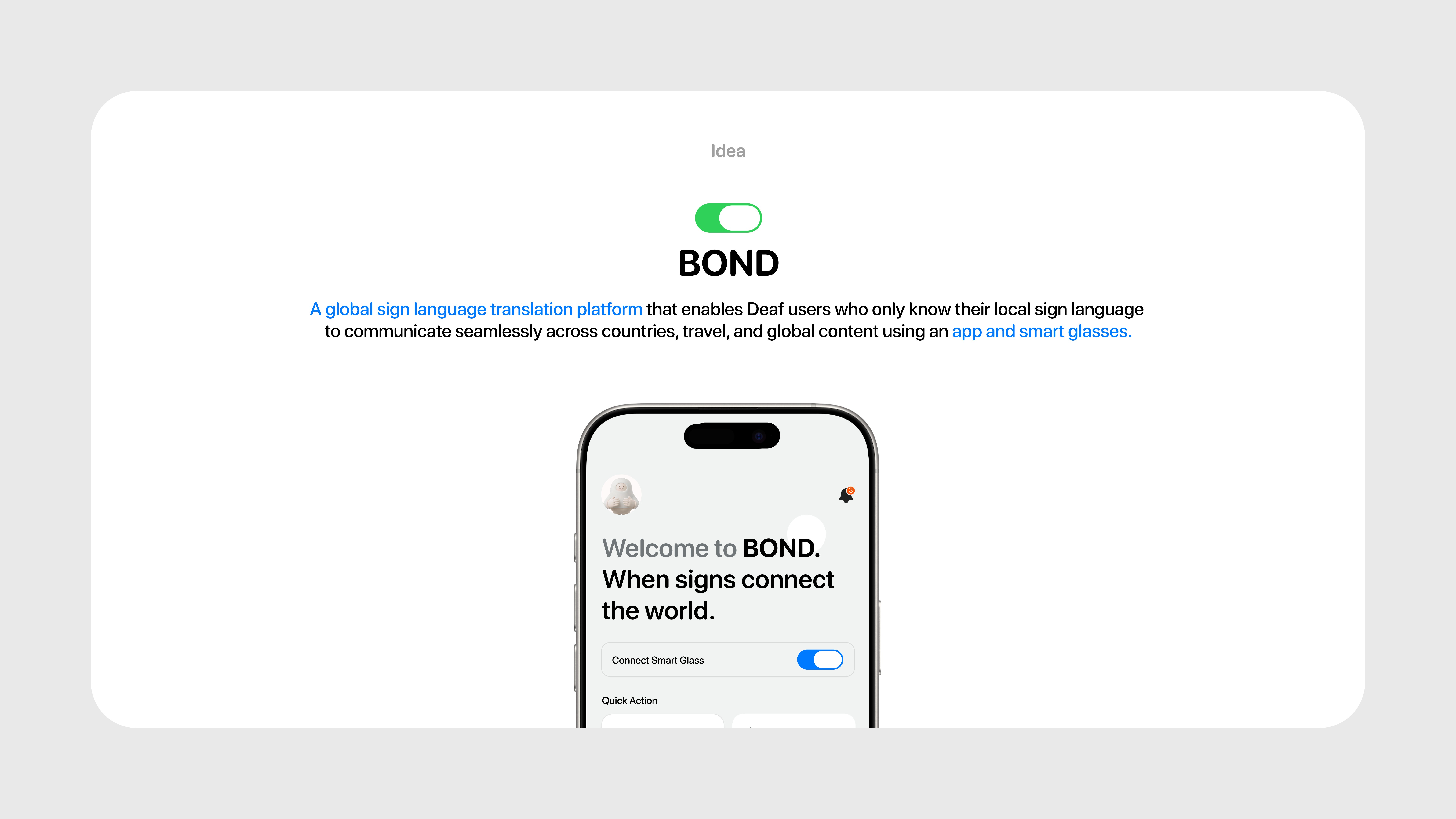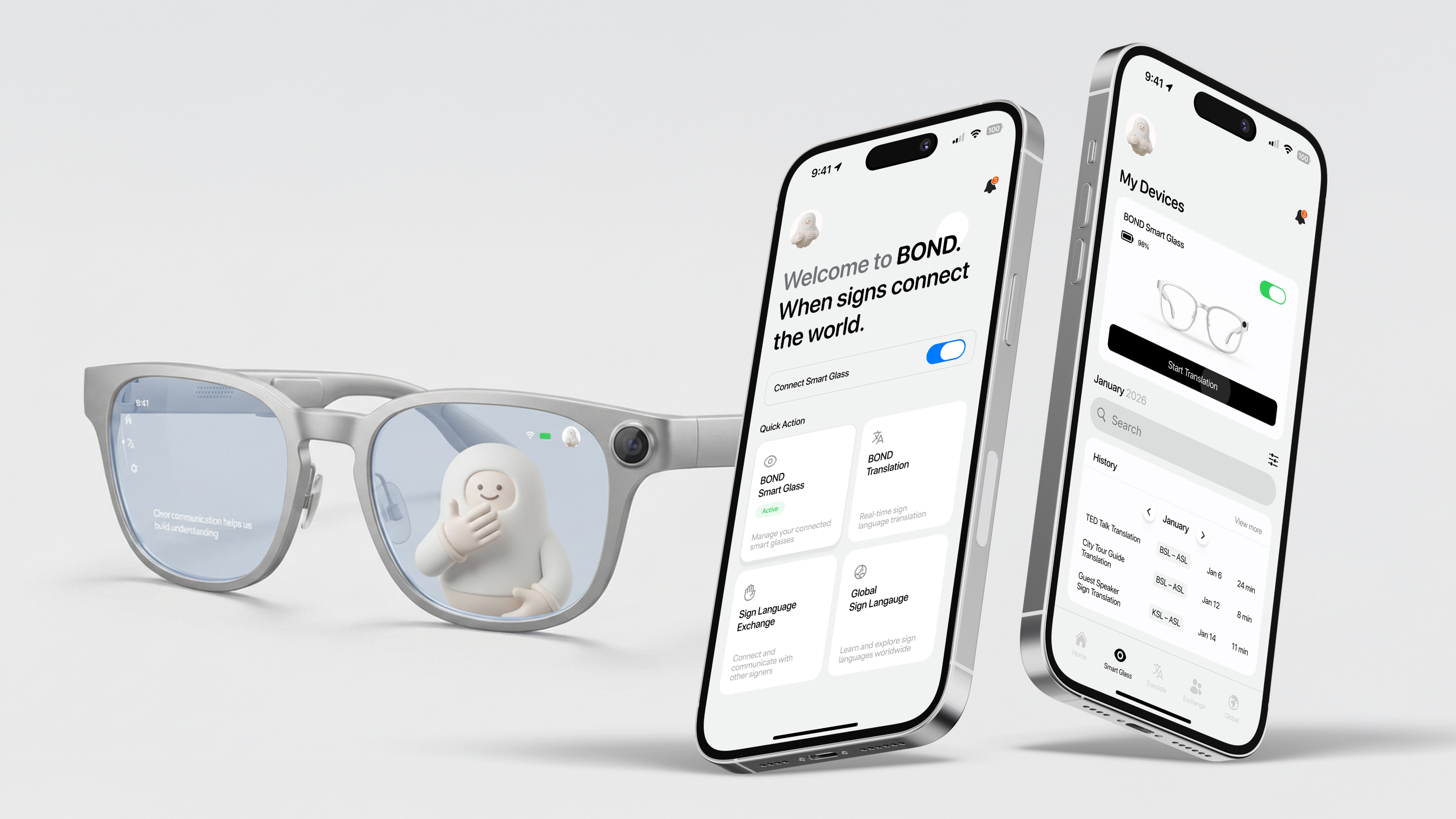 Bond is a global sign language translation platform enabling Deaf users to communicate seamlessly across countries, travel, and global content using an app and smart glasses.
