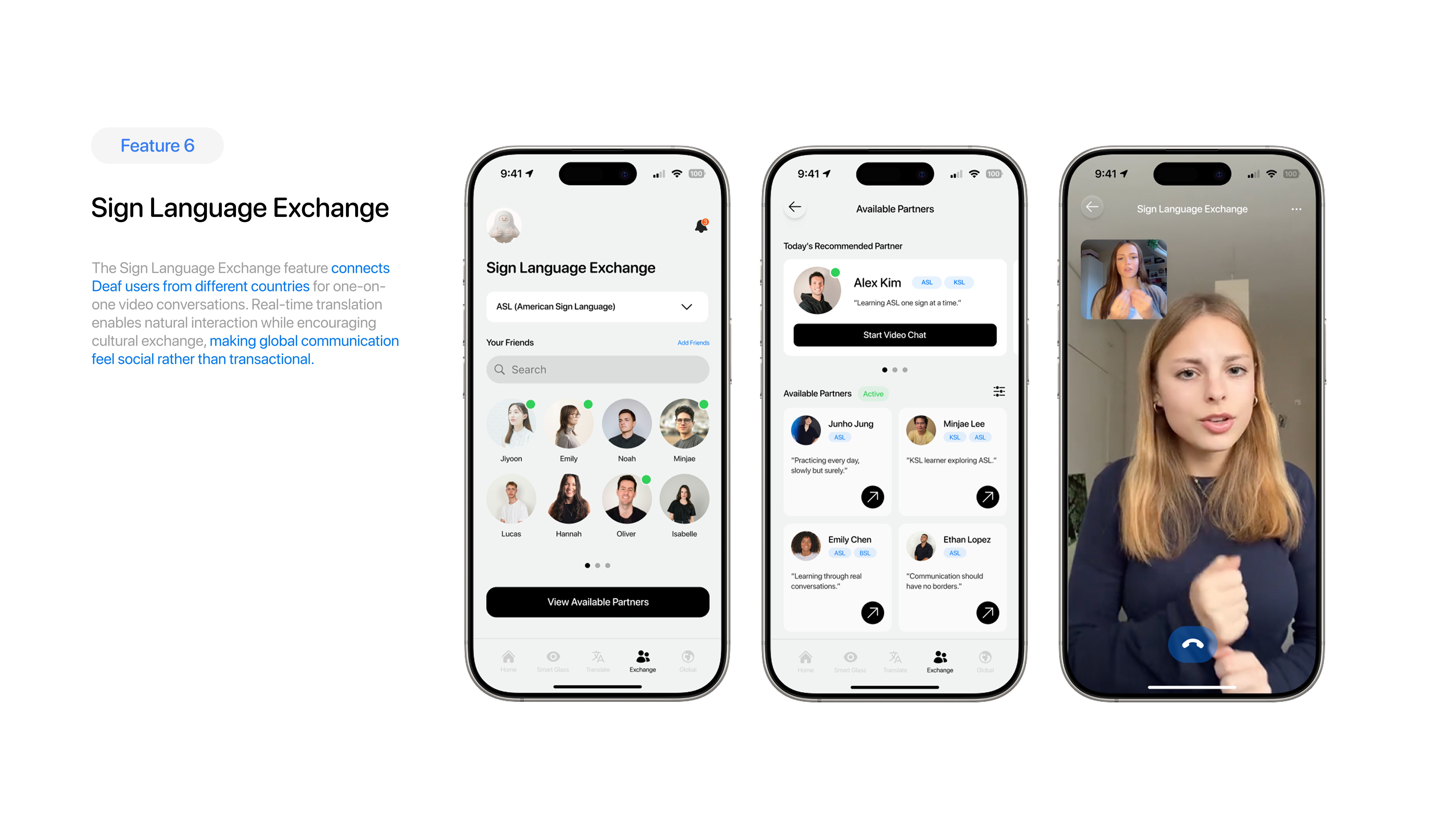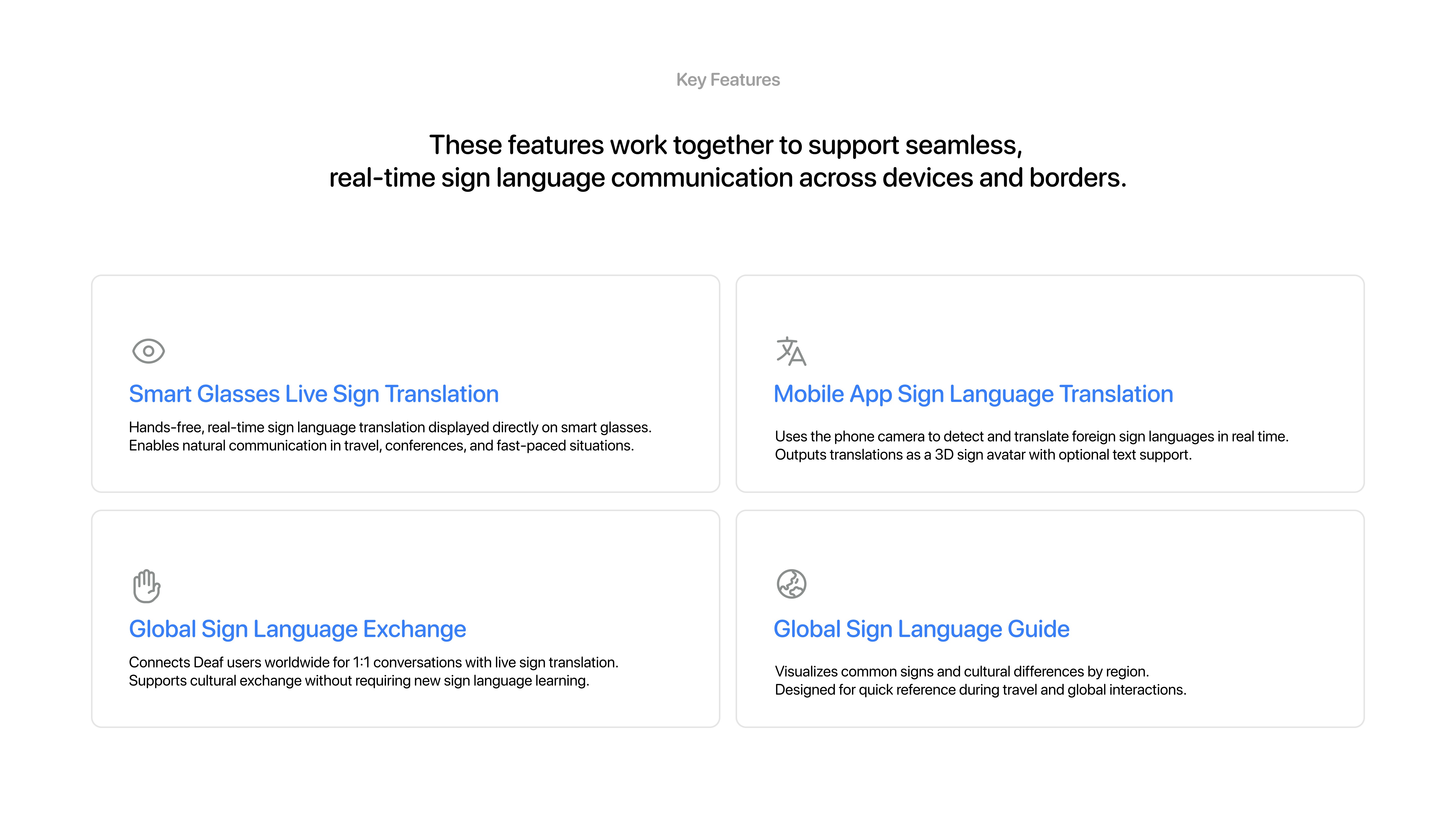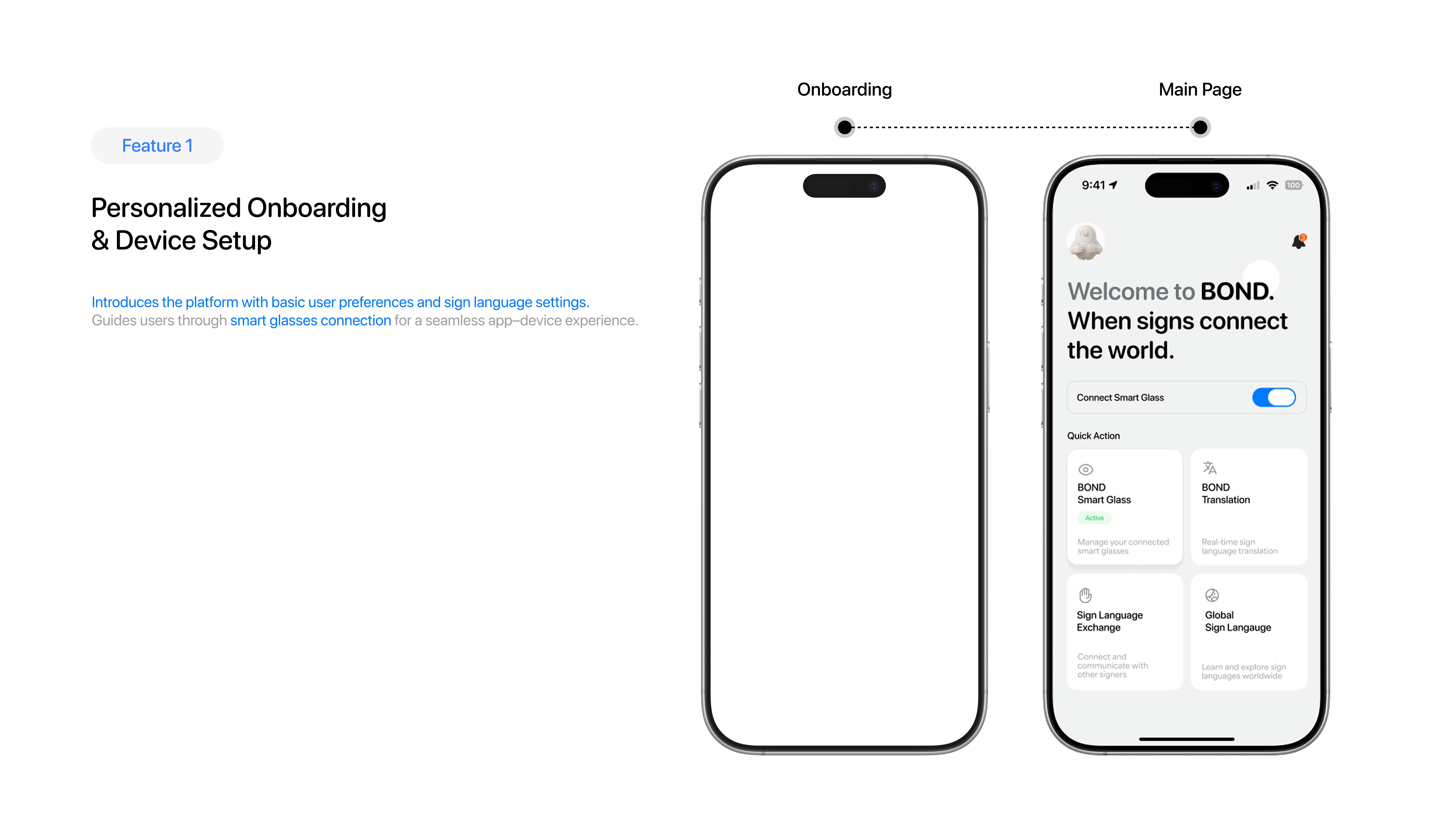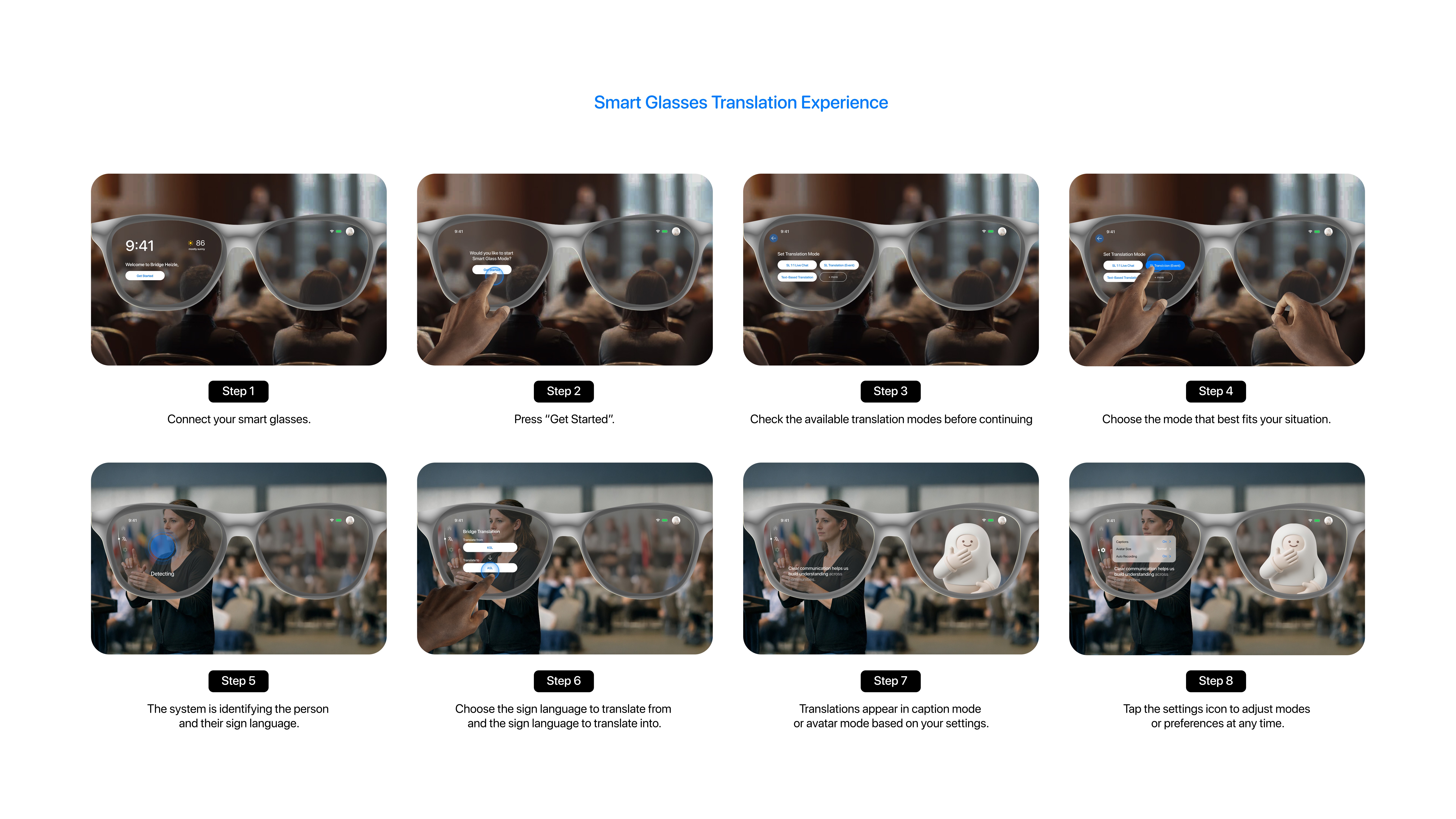 Bond is a global sign language translation platform enabling Deaf users to communicate seamlessly across countries, travel, and global content using an app and smart glasses.
