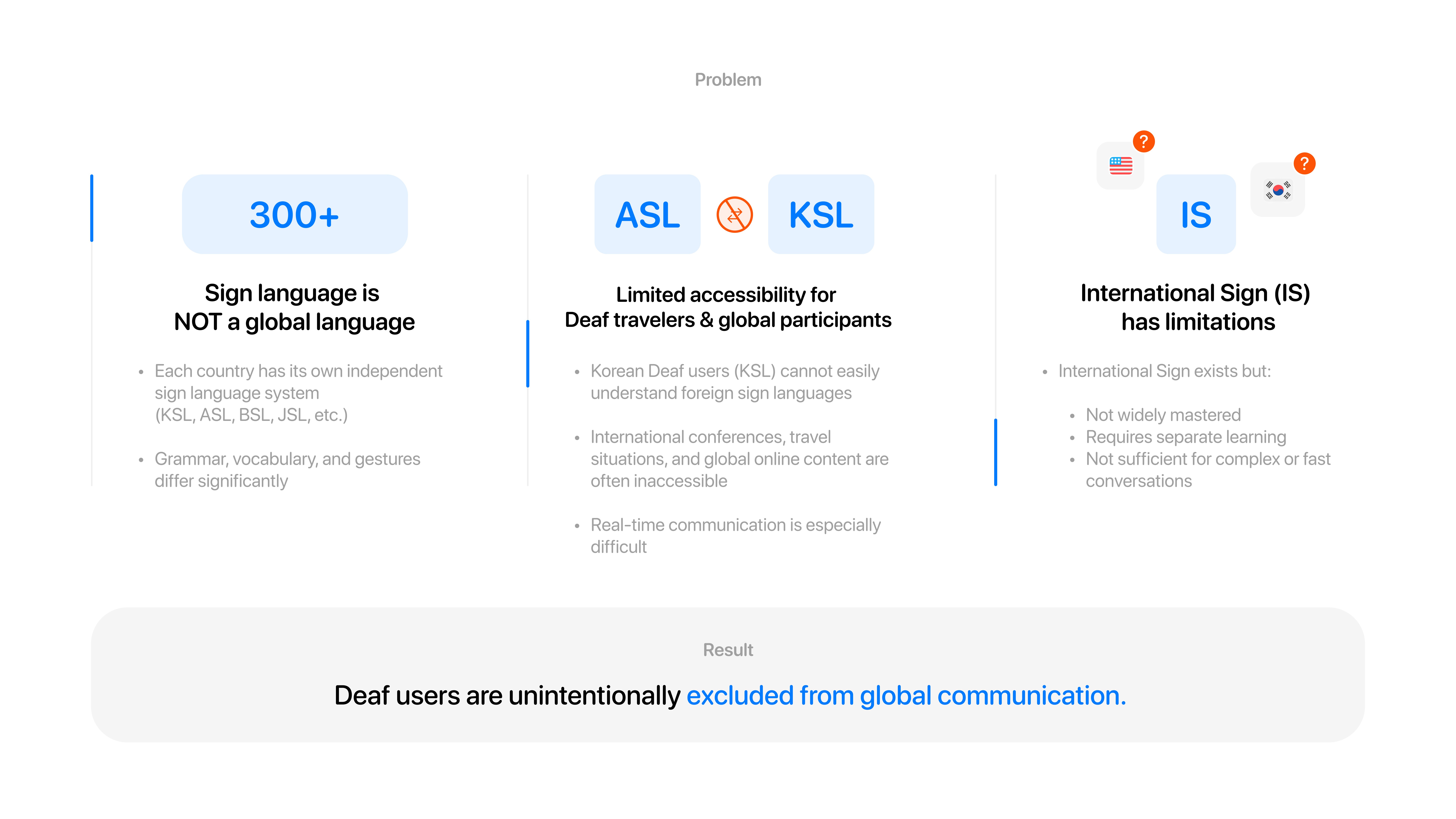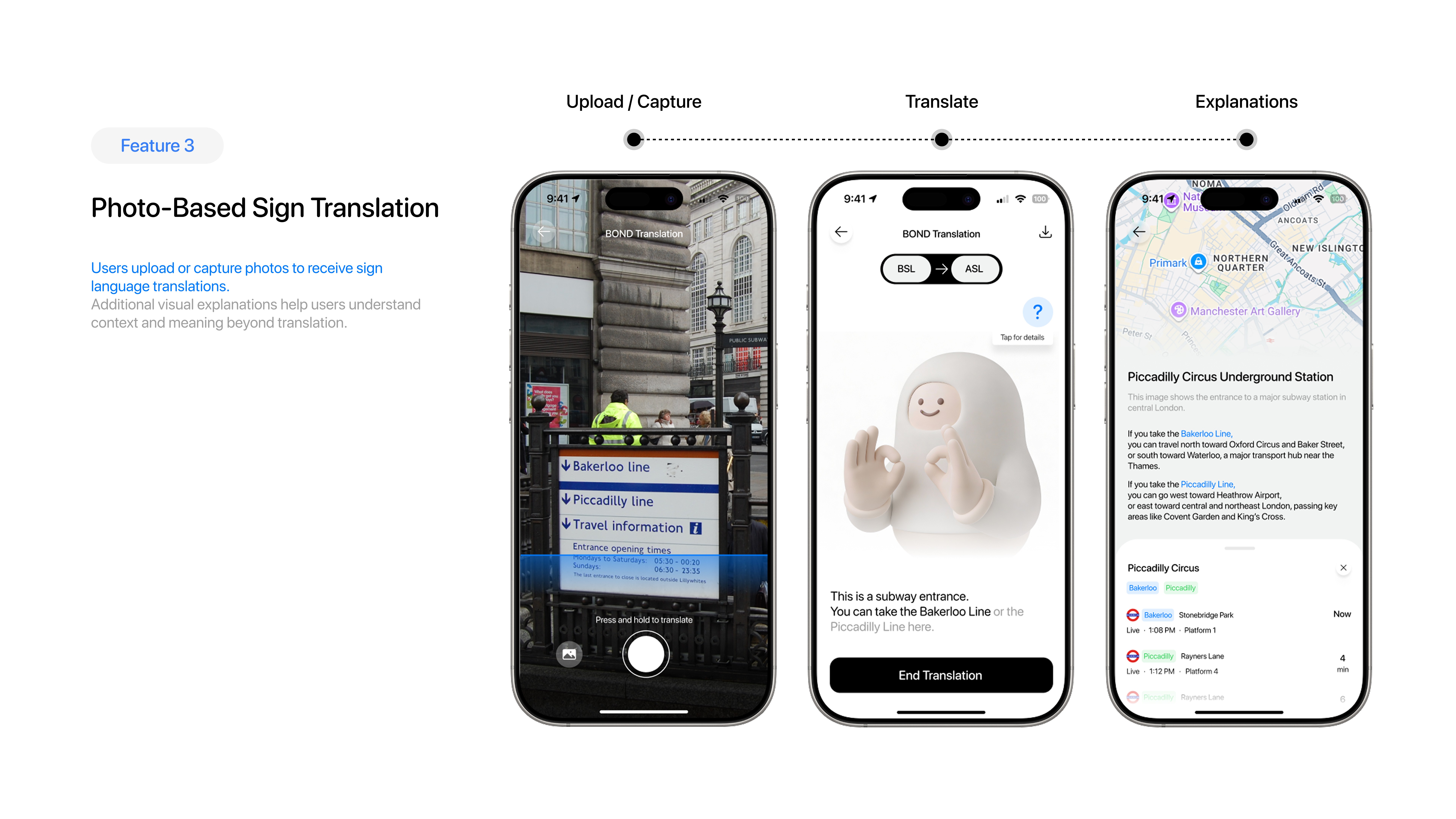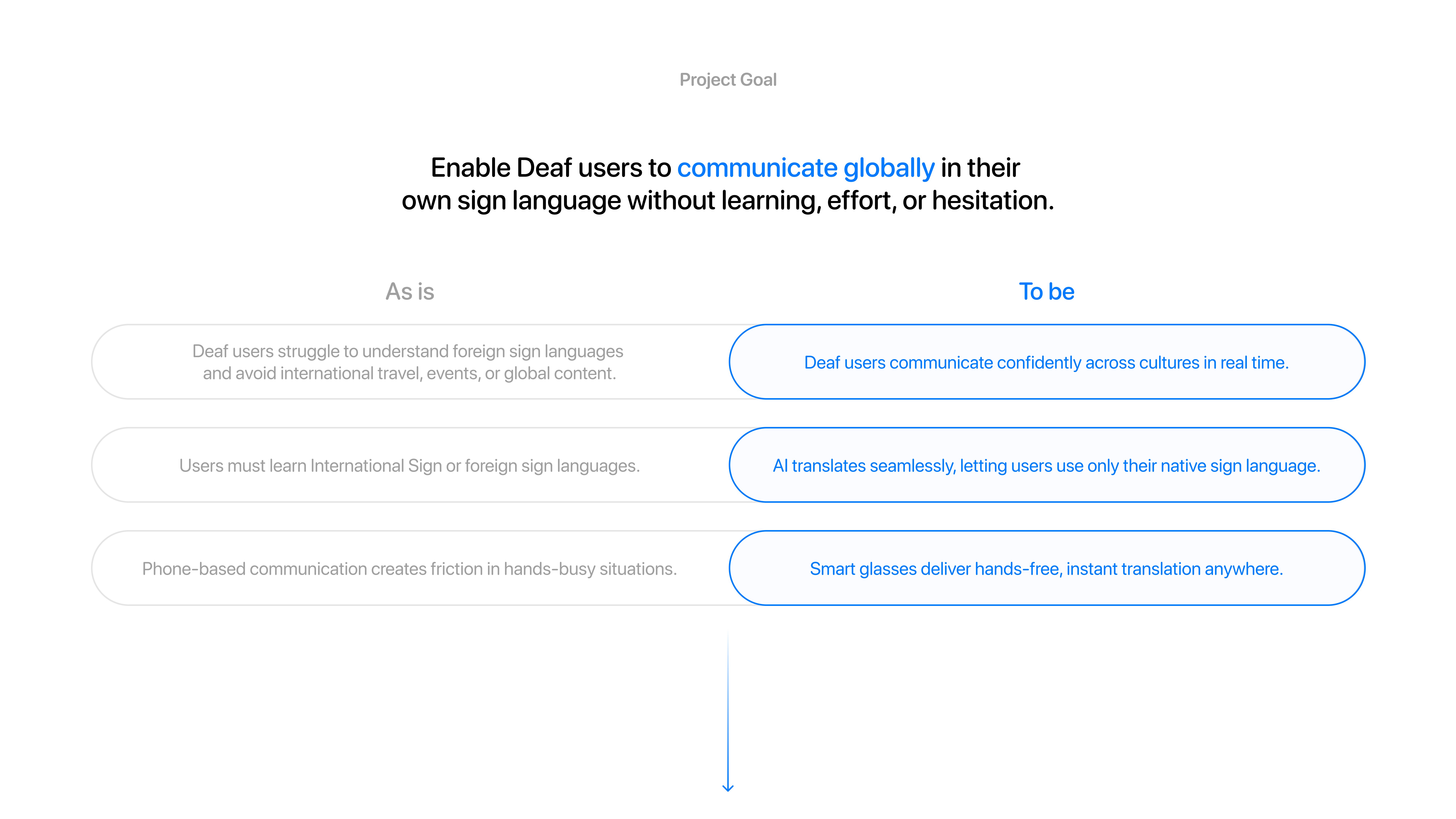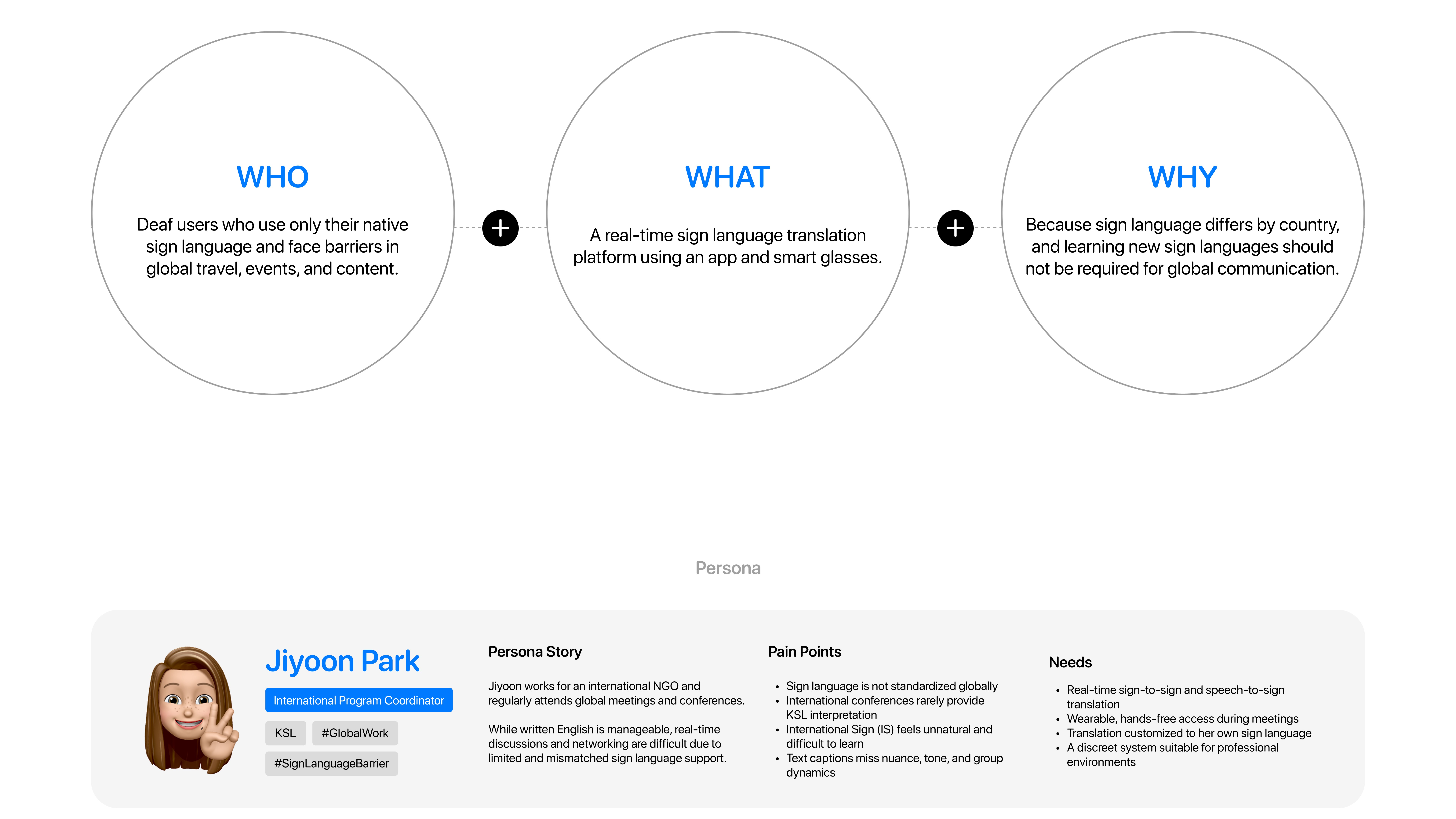 Bond is a global sign language translation platform enabling Deaf users to communicate seamlessly across countries, travel, and global content using an app and smart glasses.