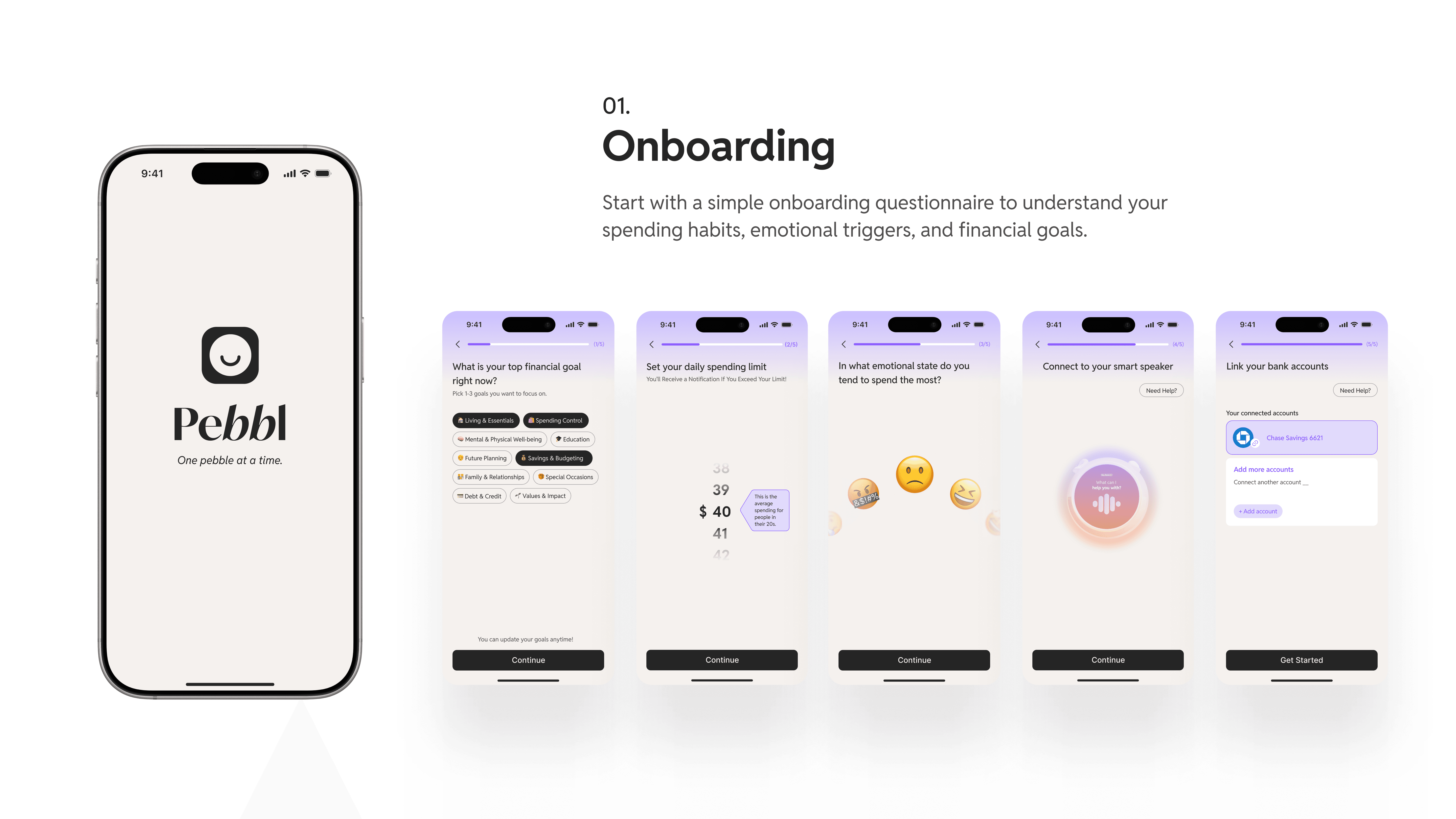 Pebble is a personal finance app that visualizes the connection between spending and emotion.